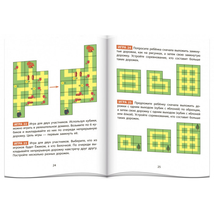 В наборе 12 кубиков. Кубики компактные и легкие, удобно ложатся в маленькую детскую руку. На каждом из них рисунки с частями лабиринта и игровые персонажи, которые "ходят" по лабиринту. В комплекте книжка для родителей с подробным описанием 50 развивающих игр и упражнений: