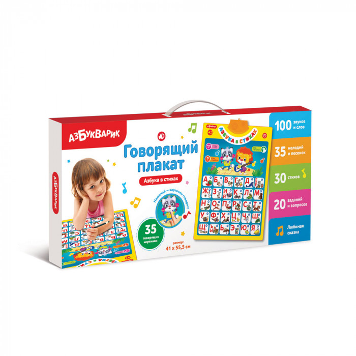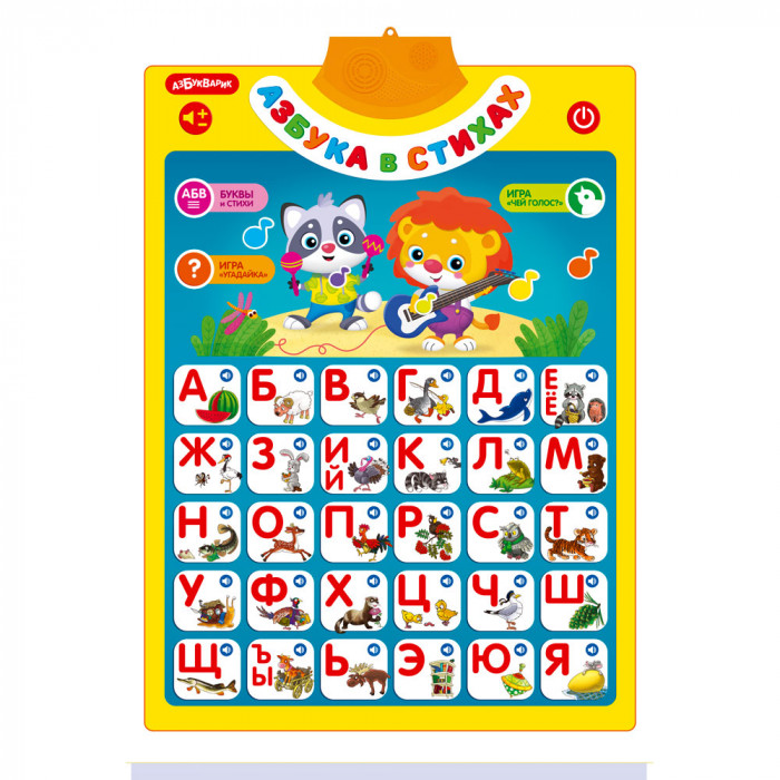 Хотите, чтобы ваш ребенок легко выучил буквы? Интерактивный говорящий плакат "Азбука в стихах" - отличный выбор! 35 интерактивных картинок, 100 звуков и слов, 30 стихов, 35 мелодий и песенок ("Песенка про алфавит", "Барбарики", "Как чудесно жить на свете", "Мамочка", "Друзья" и др.), умные игры ("Угадайка" и "Чей голос") - все это сделает обучение веселым и интересным! Плакат можно повесить на стену или играть с ним на столе.