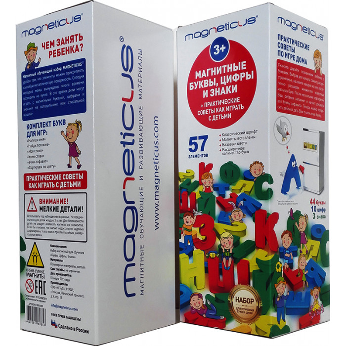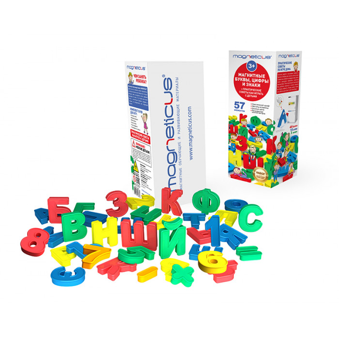 Данный набор поможет ребенку не только выучить буквы и счет, но и научиться складывать слова и решать простые примеры на сложение и вычитание. В комплекте 44 пластиковые магнитные буквы и 13 пластиковых магнитных цифр и знаков.