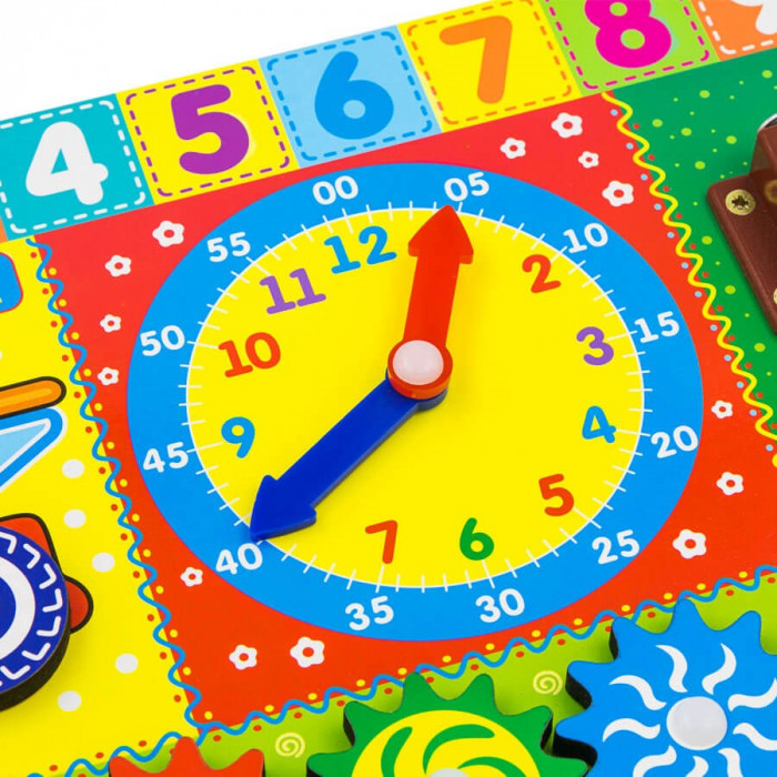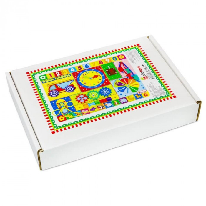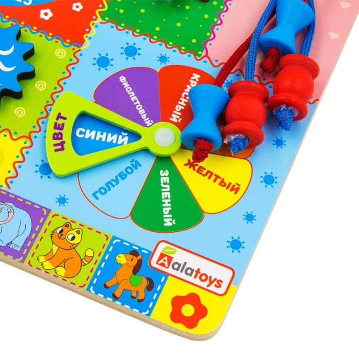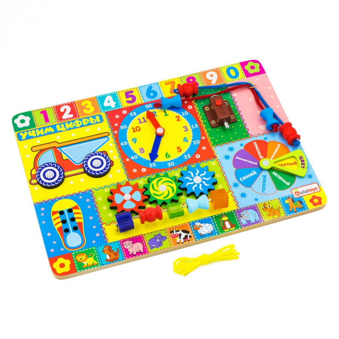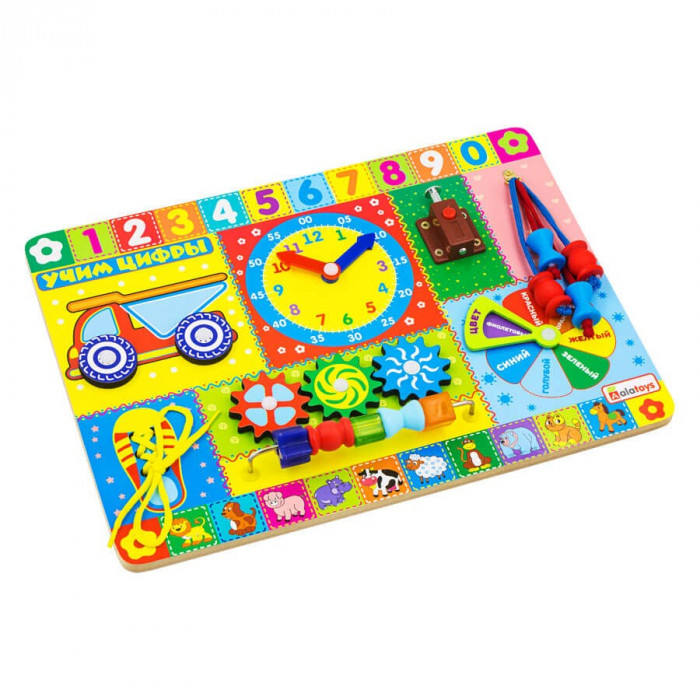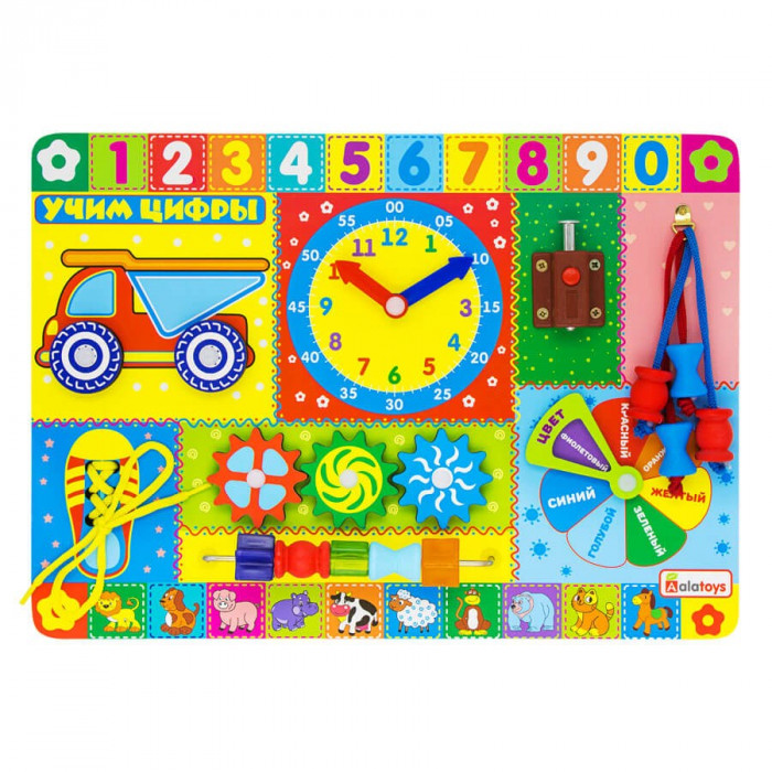 Бизиборд "Учим цифры" от ALATOYS насыщен образовательным ресурсом: циферблат часов, шестеренки, шнурки, колеса самосвала, бусины, напечатанные принт с животными и цифрами.