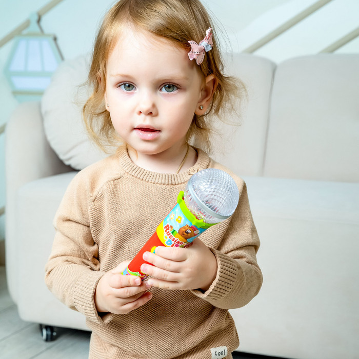 Этот удивительный микрофон превратит любой праздник в настоящее шоу! Он светится под музыку, как настоящий диско-шар! Слушай 15 детских хитов ("Частушки Бабок-Ежек", "Калинка", "Каравай", "Валенки" и др.), танцуй и подпевай любимым героям. Веселое пение с микрофоном раскроет музыкальные и актерские таланты малыша.