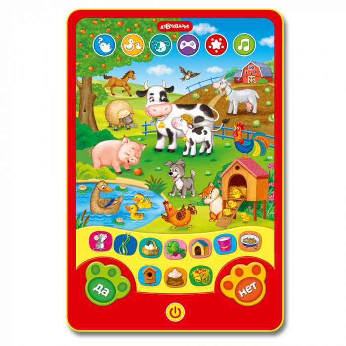 Планшетик "Веселые игры на ферме" - это 80 вопросов, загадок, логических пар, 25 говорящих картинок, 15 зверюшек, 10 песенок, 5 игр ("Чей голос?", "Найди пару", "Сочини сказку", "Загадай - я отгадаю" и "Загадки").