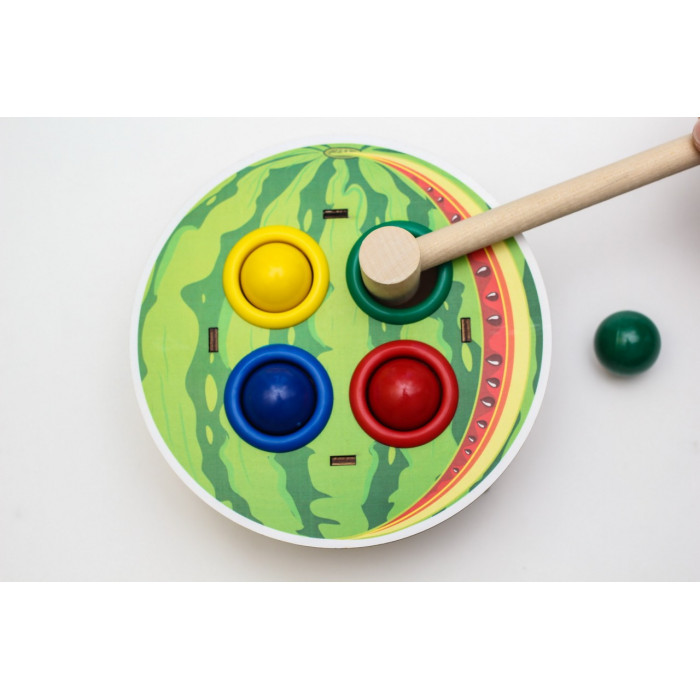 Задача ребенка — раскладывать в отверстия по цвету шарики, воздействовать на них рукой или молоточком и ловить, когда они выкатываются из специального бокового отверстия. Этот занимательный процесс приносит ребенку массу положительных эмоций и развивает любознательность.