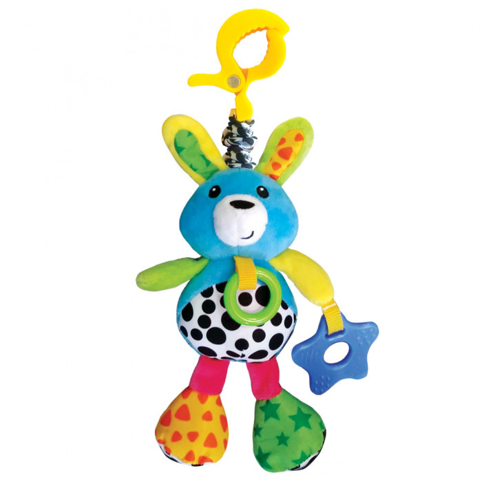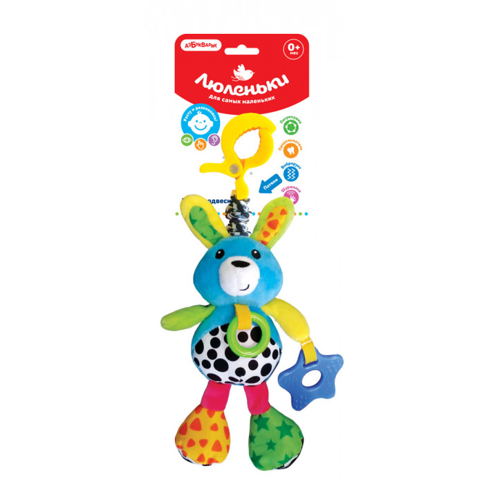 В ушках у зайчика – шуршалки, в животике – погремушка, а в лапке он "держит" прорезыватель для первых детских зубиков. Прищепка удобно крепится на кроватку или коляску.