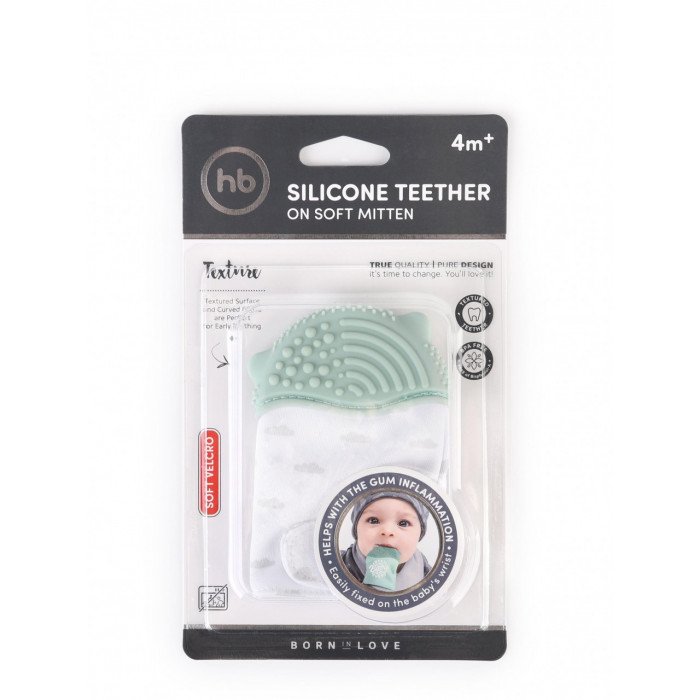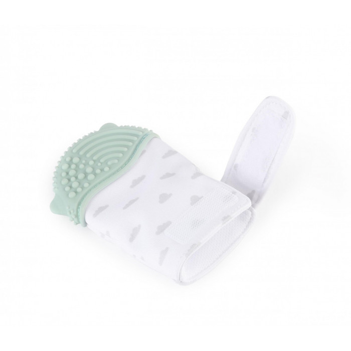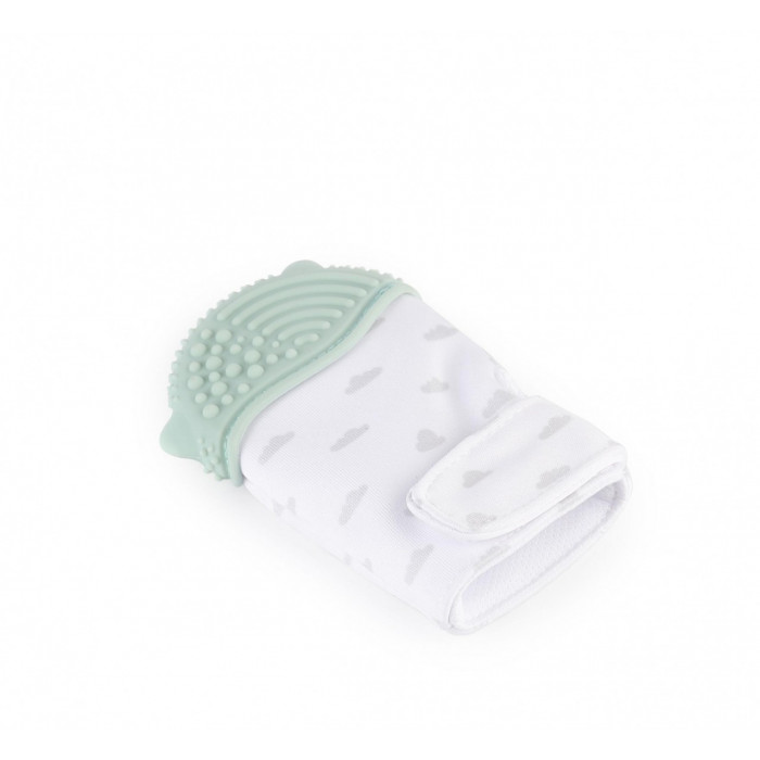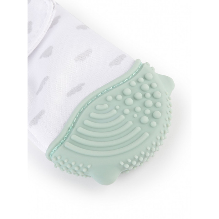 Мягкая тканая часть не стесняет движение пальчиков, не создает дискомфорт или неприятные ощущения. Верхняя часть рукавички - силикон: фактурная поверхность эффективно массирует десны малыша.