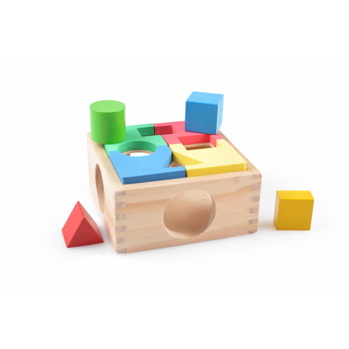 В верхней крышке коробки отверстия четырех различных форм: круг, треугольник, прямоугольник и квадрат. К ним нужно подобрать соответствующие фигурки. Вынимаются фигурки через более крупные отверстия по бокам.Задача усложняется необходимостью сложить мозаику на крышке: четыре цветные пластинки выкладываются таким образом, чтобы их прорези совпадали с отверстиями на ящике. Собрав детали неправильно - не сможем вставить фигурки в отверстия. Ребенок познакомится с основными цветами и формами, научится находить пары по подобию, а так же разовьет мелкую моторику.