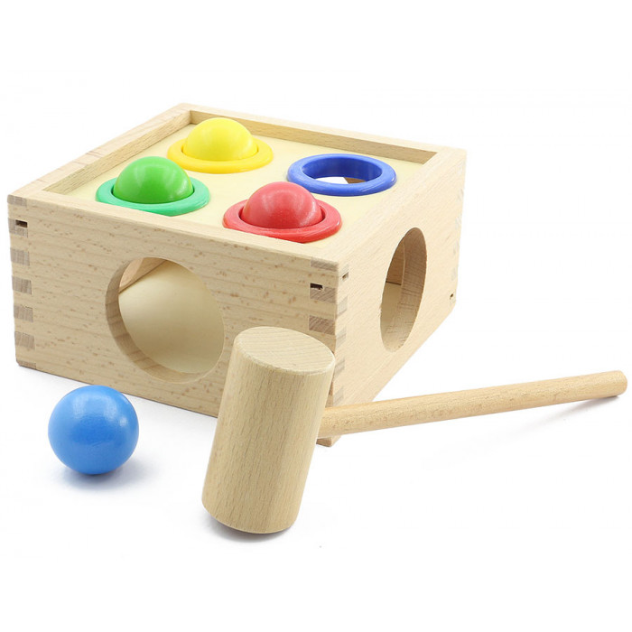 Игрушка на развитие моторики и общей координации движений. Разновидность гвоздей-перевертышей. Разноцветные шарики вставляются каждый в свою лунку, по цветам, и забиваются молоточком, чтобы покатиться по наклонному днищу в арку. Малышу будет очень интересно, он научится сопоставлять цвета и управляться с молоточком. Деревянные шарики удерживаются от свободного проскакивания пластиковыми кольцами, вклеенными в отверстия деревянной основы.