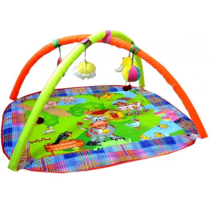 На поверхности коврика изображены яркие картинки. Четыре мягкие игрушки на дугах будут способствовать развитию у ребенка хватательных рефлексов, концентрации внимания и способности различать цвета.