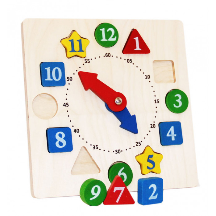 Многофункциональные часики познакомят детей с понятием времени. На циферблате по кругу расположено 12 фигур-вкладышей, отличающихся между собой формой и цветом. В игре малыши познакомятся с цифрами, различными геометрическими фигурами, научатся считать до 12, самостоятельно устанавливать часы и минуты. Такая игровая деятельность способствует тренировке логического мышления, развитию внимания и зрительной памяти, усидчивости, укреплению мелкой моторики рук.
