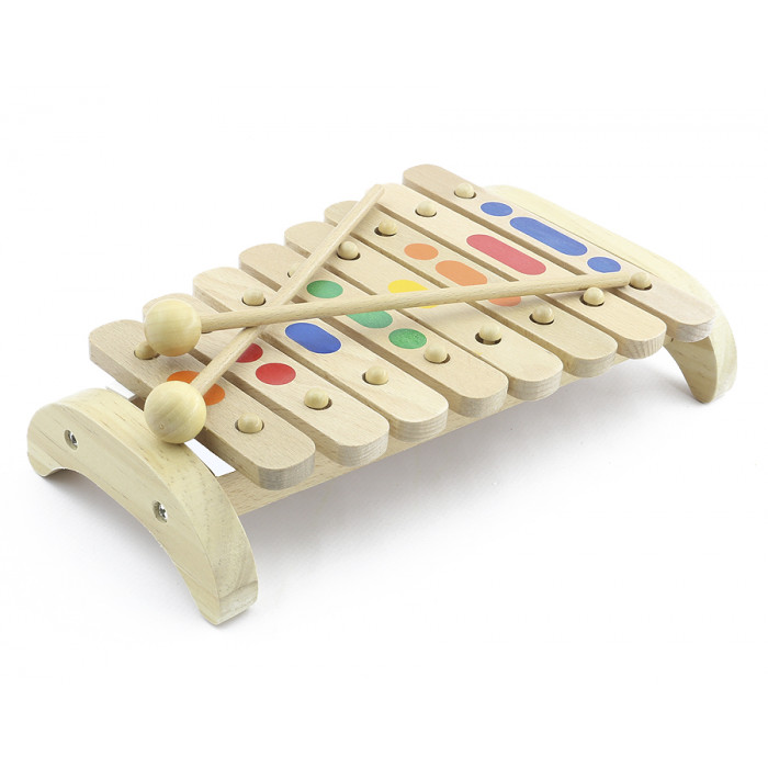 Представляет собой музыкальный инструмент, который состоит из основания и укрепленного на нем набора разноцветных деревянных пластинок. У деревянного ксилофона очень приятный, чистый, негромкий звук.Для того чтобы ксилофон зазвучал, по пластинкам надо ударять деревянными палочками. Извлекая звуки, ребенок пытается сочетать их в мелодию, в определенные ритмы. Разноцветные деревянные пластинки ксилофона расположены в определенном порядке, как в радуге, и закономерно повторяются. Яркие цвета понравятся малышам, а музыка поможет выучить названия цветов. И малышам и деткам постарше игрушка доставит много радости.Развитие навыков. Игра на таком ксилофоне помогает развитию у ребенка музыкальной памяти, ритма, мелодического слуха.