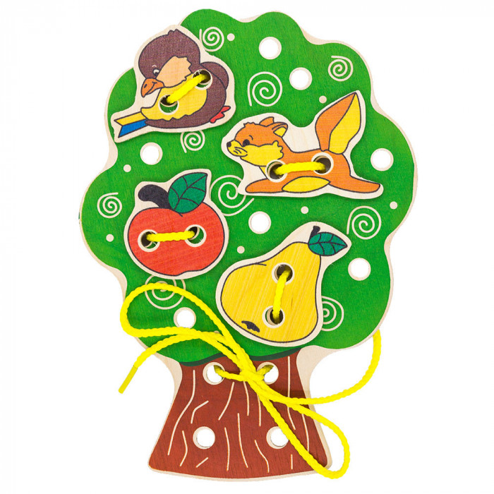 Шнуровка — полезная детская игра. Цель игры — разместить животных и фрукты на дереве с помощью цветного шнурка, продевая его в отверстия. Этот процесс доставит большое удовольствие малышу.