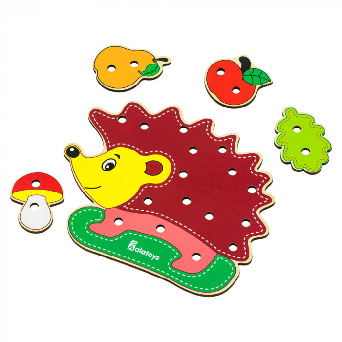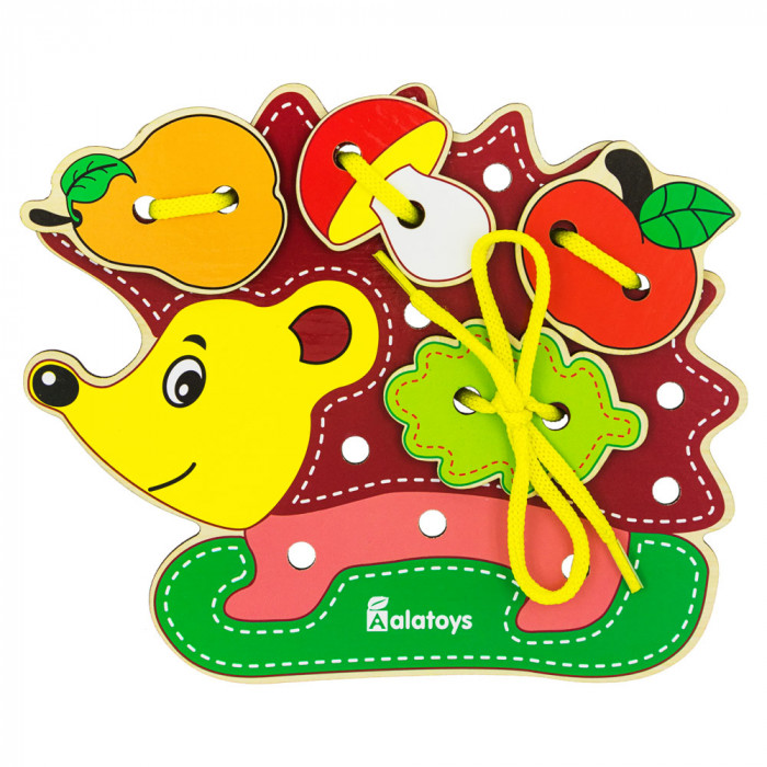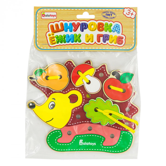 Шнуровка "Ежик" от ALATOYS представляет собой красочную основу в виде ежика и 4 красочные фигурки.
