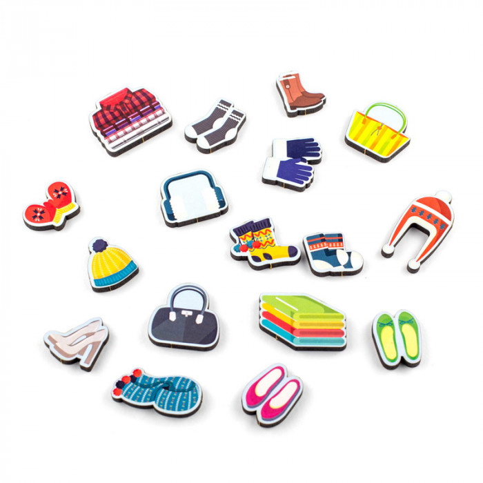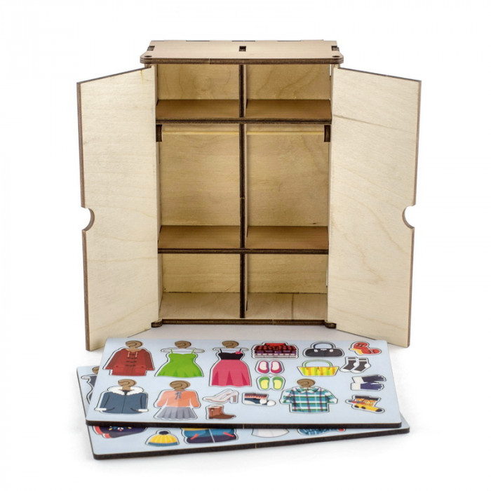 Игрушка представляет собой конструкцию шкафа с полочками, открывающимися дверцами и комплекта фигур с изображениями предметов гардероба.