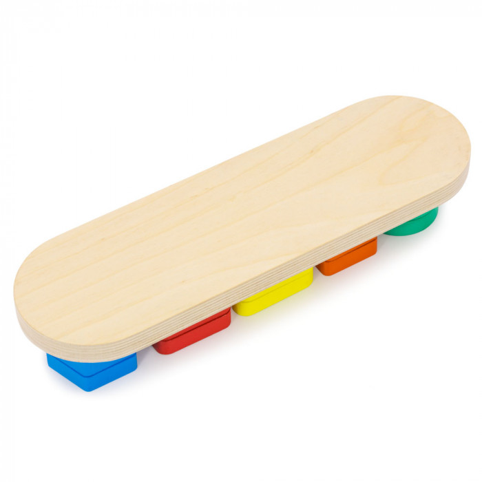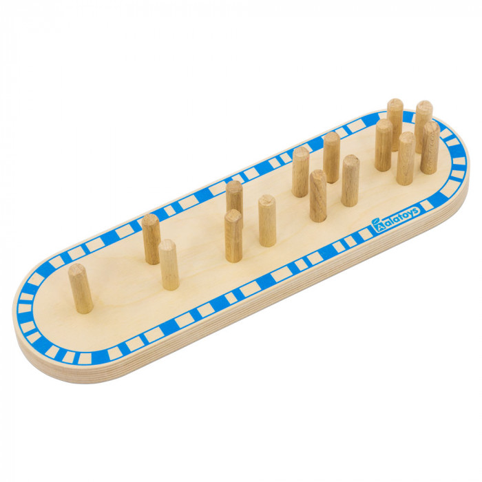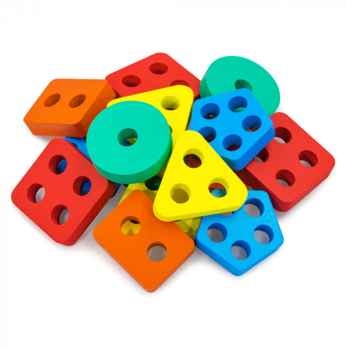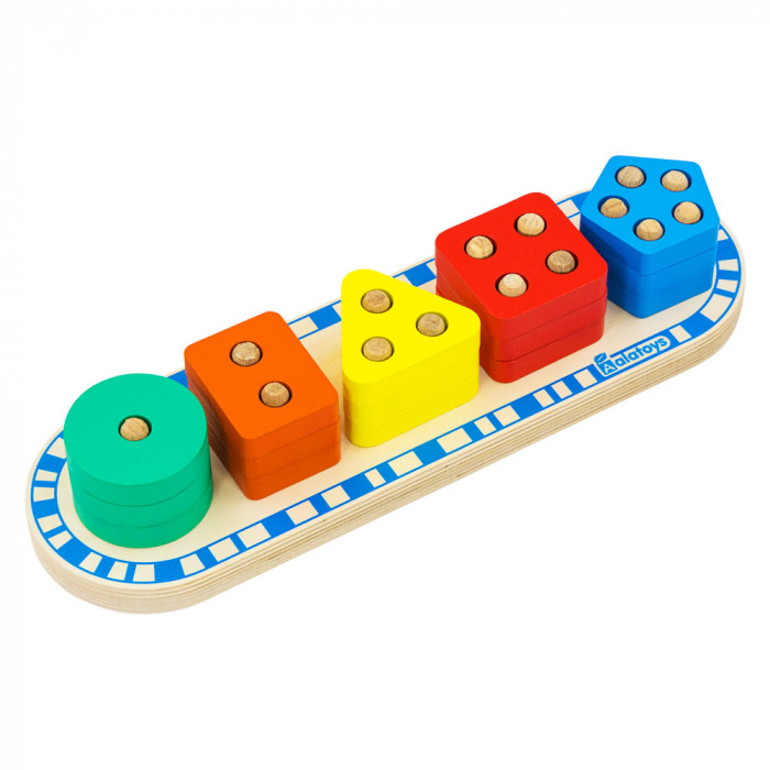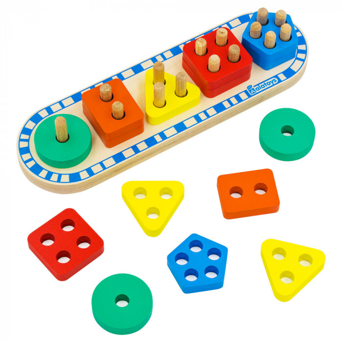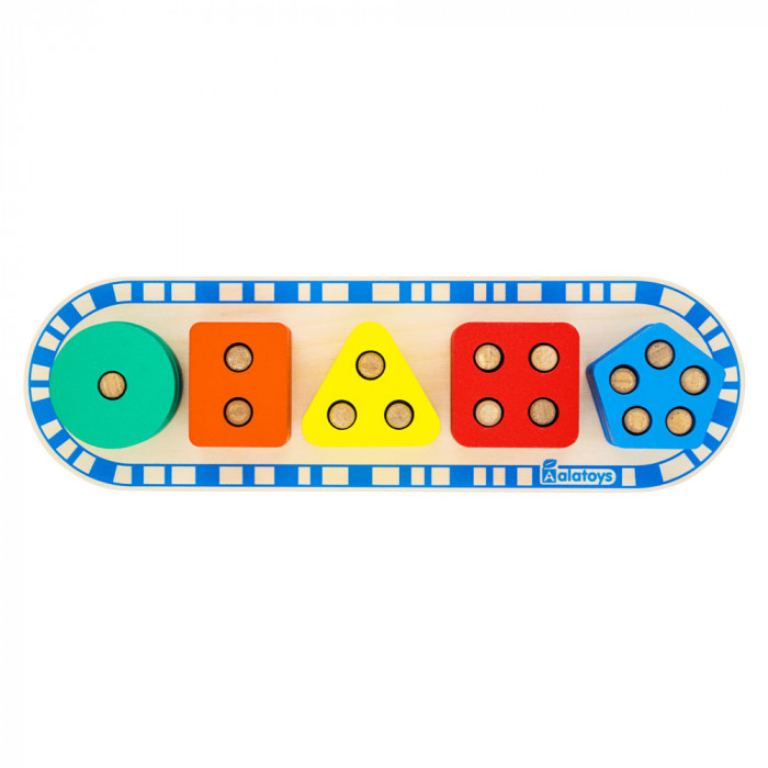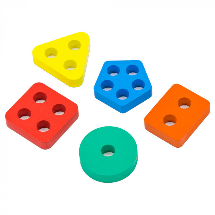 Этот набор представляет планку с зафиксированными деревянными штырьками для 5 разных геометрических фигур: круга, прямоугольника, треугольника, квадрата, пятиугольника. Каждая деталь имеет свой цвет, разное количество отверстий для нанизывания на штырьки и индивидуальное место на планке, которое ребенок должен найти.