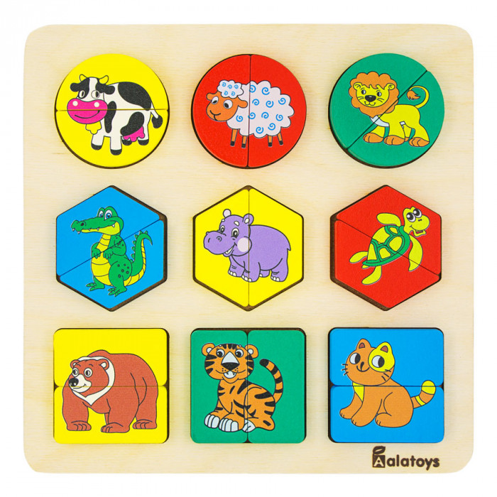 На ярком фоне расположены фигуры с картинками разных животных. Они отличаются по форме фигурки, ее цвету.
