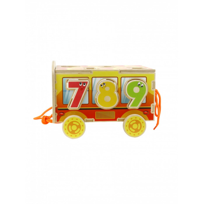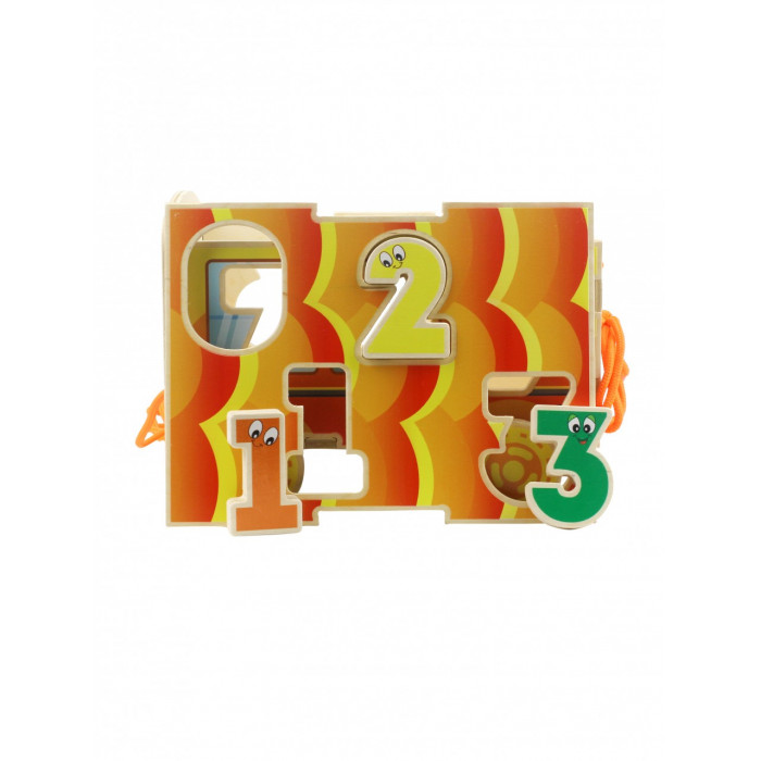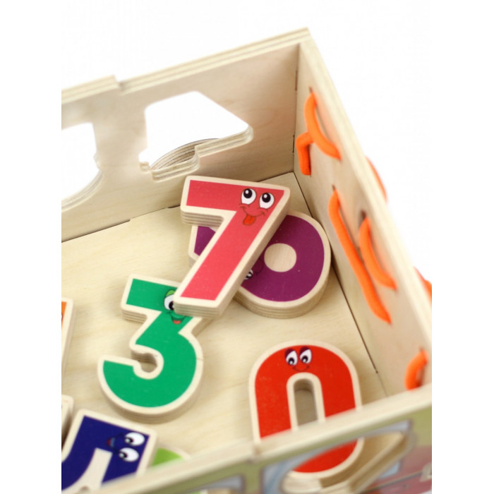 - "Сортер" для обучения порядковому счету. На боковых сторонах и на крышке сверху фигурные прорези по форме цифр от 0 до 9. Задача ребенка - подобрать для каждого отверстия нужную фигурку из комплекта, вставить и протолкнуть внутрь. Чтобы быстрее запомнить, проговаривайте названия цифр и цвет фигурок.