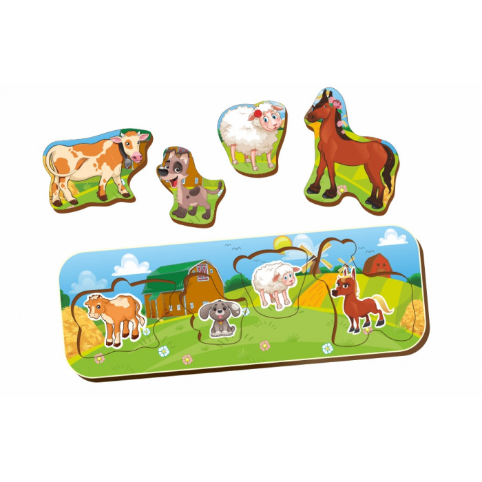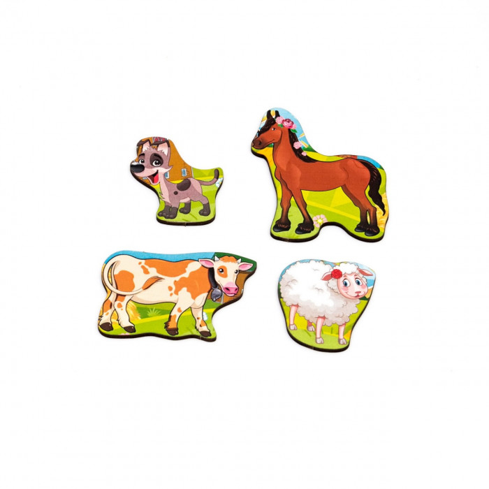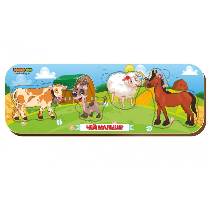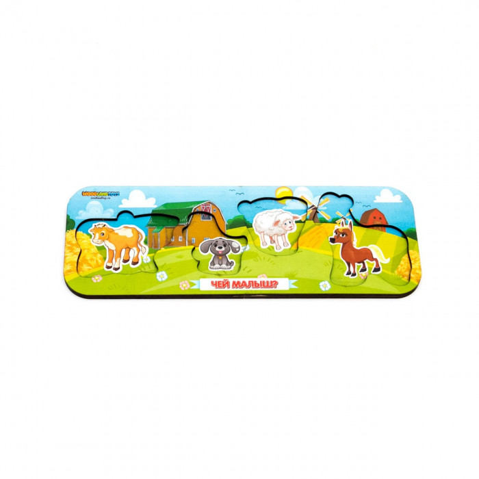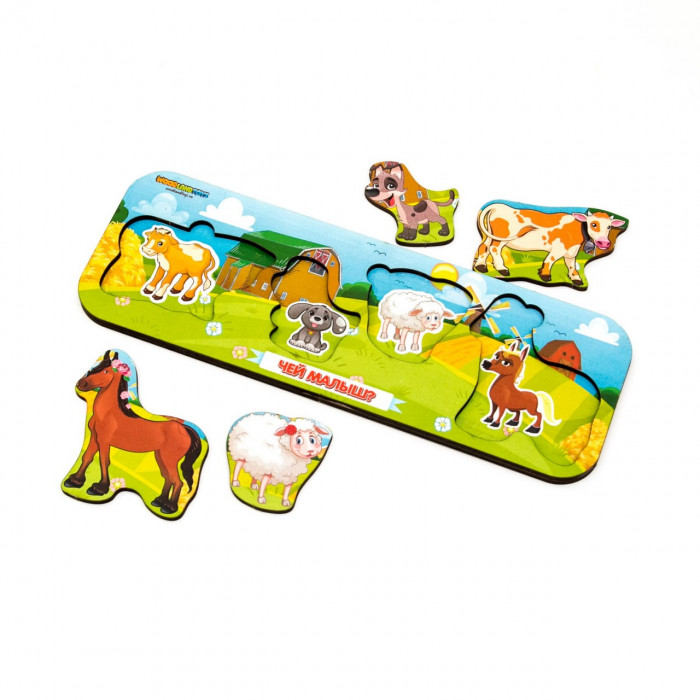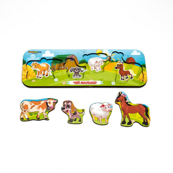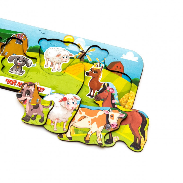 Рамка-вкладыш расскажет малышу, как зовут детенышей коровки, собачки, овечки и лошадки. Пазл поможет с пользой провести досуг, развить цветовое восприятие, логическое мышление и мелкую моторику.