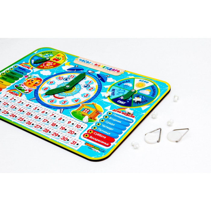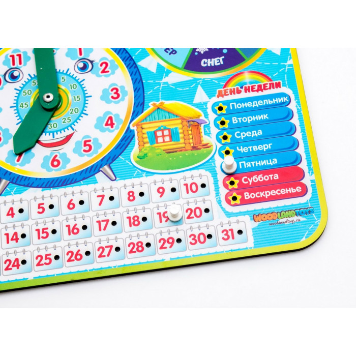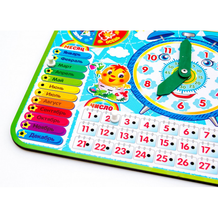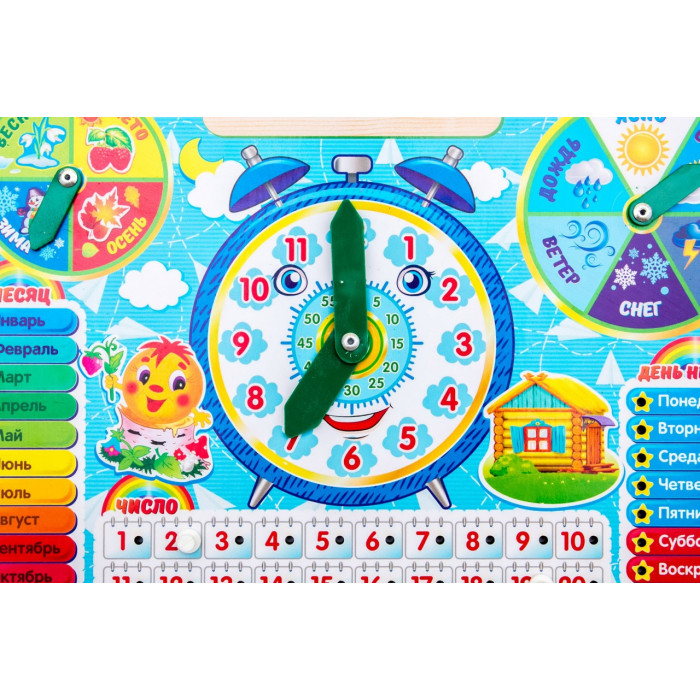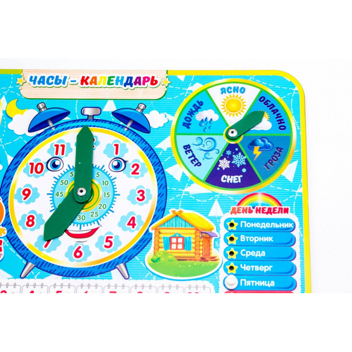 Игрушка представляет собой красочный деревянный планшет с подвижными стрелками и съемными пластиковыми деталями-указателями. Изображение разделено на несколько тематических зон, которые знакомят с временем, датой, месяцами, днями недели, временем года, погодными условиями.