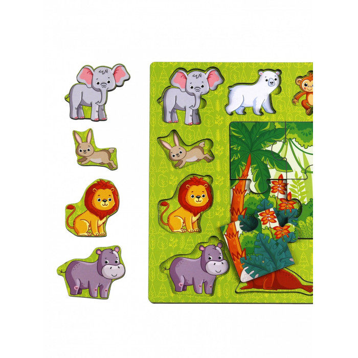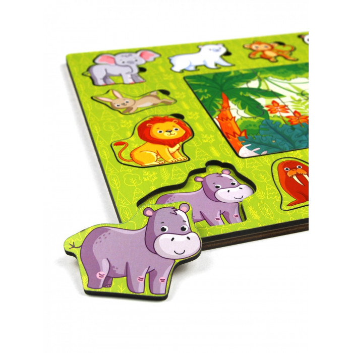 Вкладыши "В лесу" - это развивающая игрушка для самых маленьких. Она представляет собой красочный деревянный планшет с рамками для вкладывания, пазл из 6 деталей и 12 фигурок для вкладывания с изображениями животных и птиц.