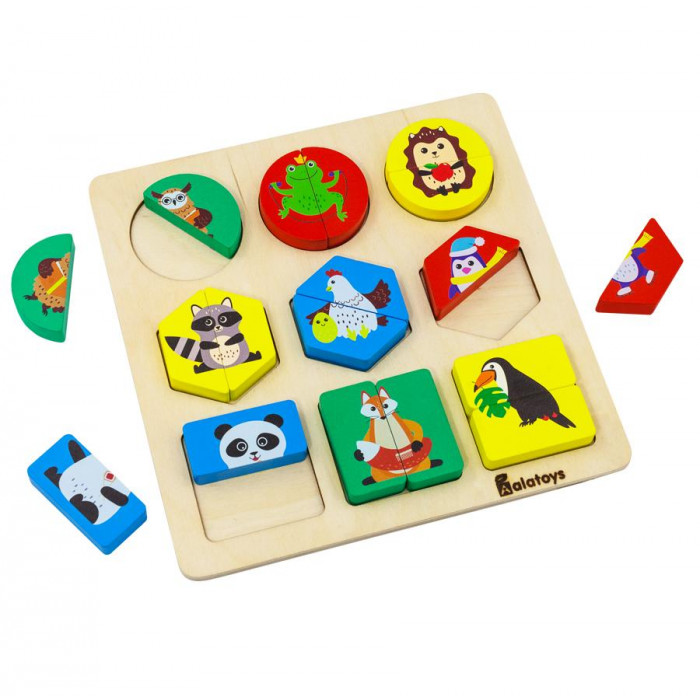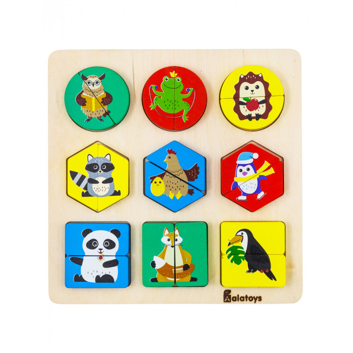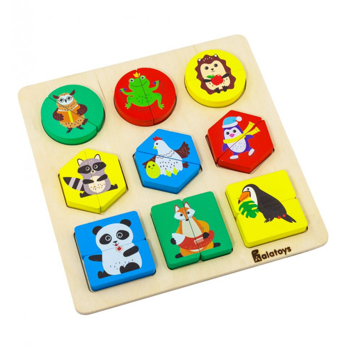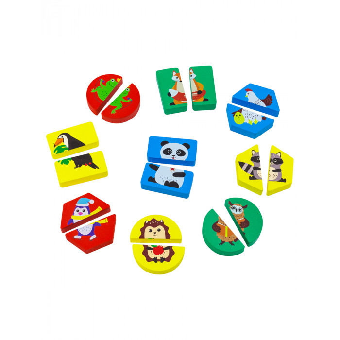 На ярком фоне расположены фигуры с картинками разных животных. Они отличаются по форме фигурки, цвету.