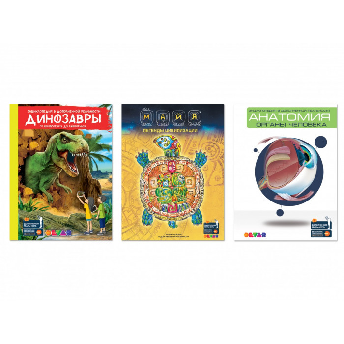 Комплект энциклопедий DEVAR состоит из трех книг с уникальной технологией дополненной реальности. В дополненной реальности с помощью бесплатного приложения DEVAR можно оживить и рассмотреть в 4D древних динозавров и таинственные сокровища древних племен Майя, погрузиться в мир существ которые давно ушли с нашей планеты и увидеть богов, которым поклонялись одни из самых могущественных племен на Земле.