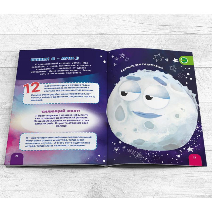 Изучать неизведанное в энциклопедии "Загадочный космос" помогут сами планеты. Яркие и милые персонажи — небесные тела, наделенные уникальными характерами, рассказывают о себе самое интересное. С помощью технологии дополненной реальности они сходят со страниц и поют о себе! Вместе со словами песенок малыш запомнит основную информацию о планетах.