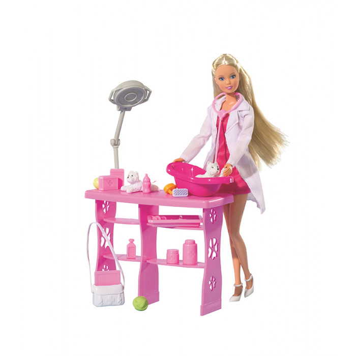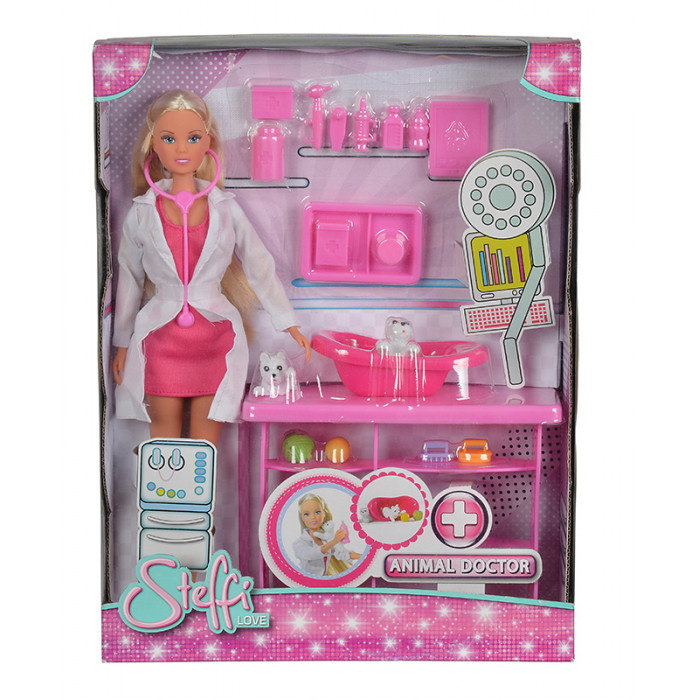 Кем ты хочешь стать, когда вырастешь? Штеффи всегда мечтала стать ветеринаром, чтобы лечить животных! У нее для этого есть всё необходимое: кошечка, собачка, стол с лампой для осмотра, игрушки для животных: мячик и клубок ниток, ванночка для купания пациентов, щетки для ухода за шерстью зверюшек, бутылочка для кормления, стетоскоп, молоточек для проверки рефлексов, шприц, различные коробочки с лекарствами. Кукла-Штеффи уже надела белый халатик и ждет новых мохнатых пациентов!