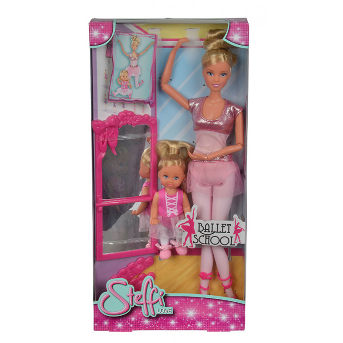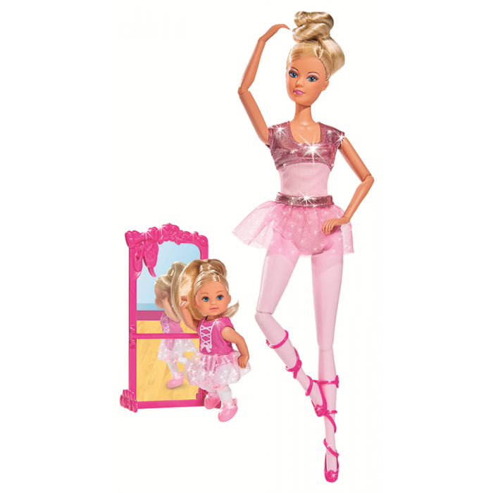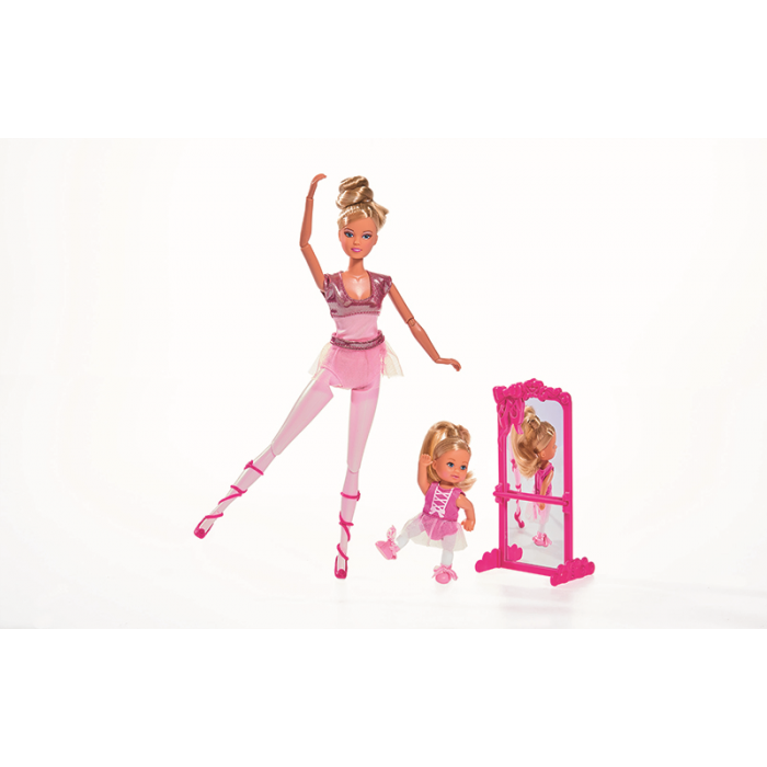 Волшебный и удивительный мир балета манит всех девочек. Малышка Еви решила к нему приобщиться, а Штеффи ей в этом помогает. Девушки подготовились к занятиям: у них есть балетный станок с зеркалом, чтобы оттачивать мастерство выполнения изящных танцевальных движений, которые куколки могут выполнять благодаря шарнирной конструкции. Для танцев обе куколки собрали свои волосы в элегантные, но практичные прически, нарядились в балетные пачки и пуанты.