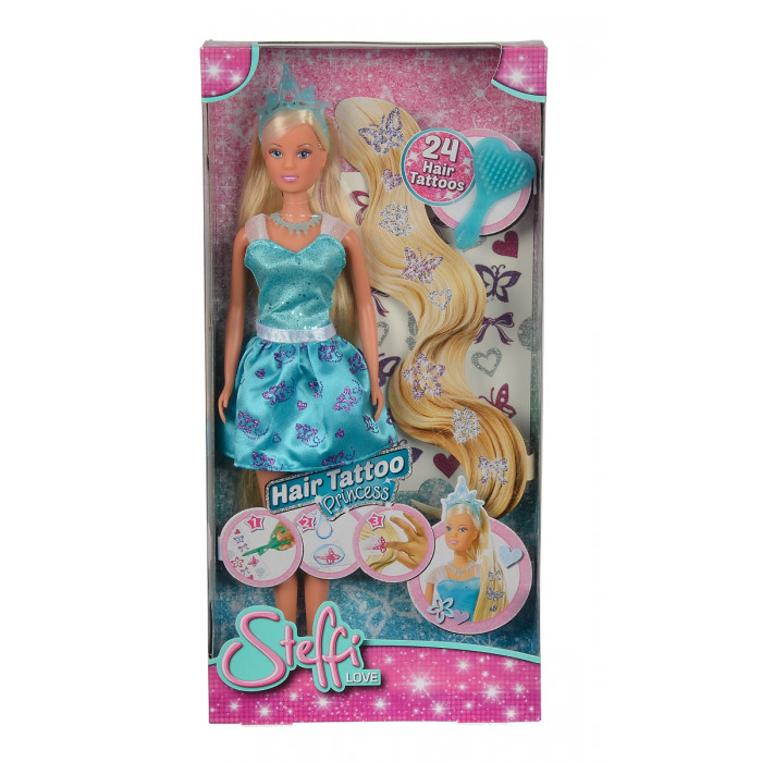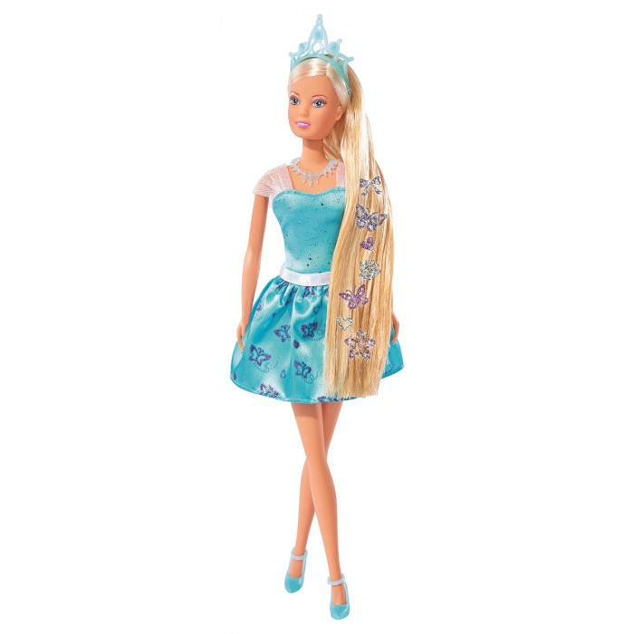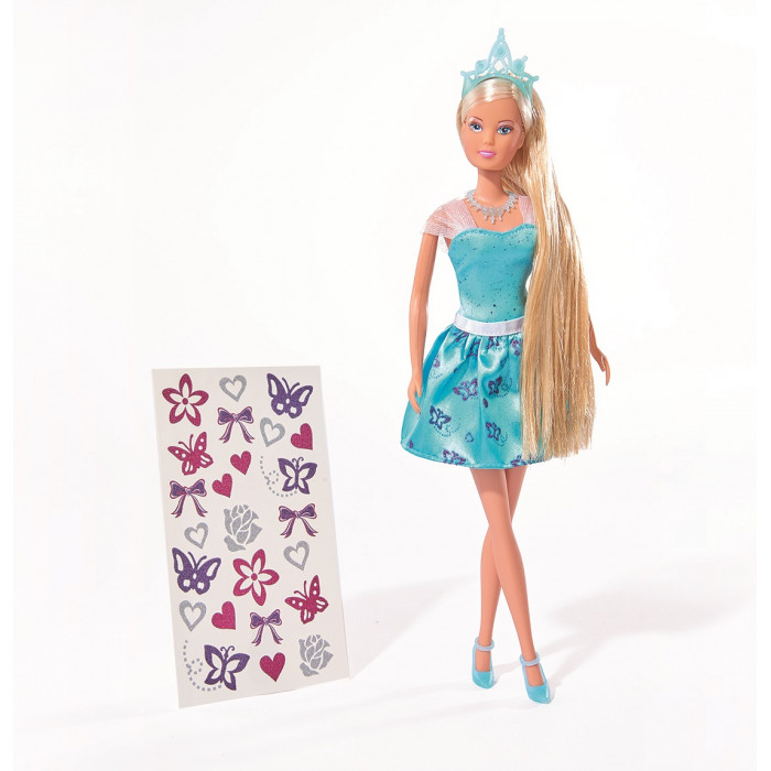 В комплект входит расческа и 24 наклейки. У Штеффи длинные светлые волосы, которые отлично ложатся в прически. Кукла одета в милое платьице, а туфельки, ожерелье и тиара подобраны в цвет платья.