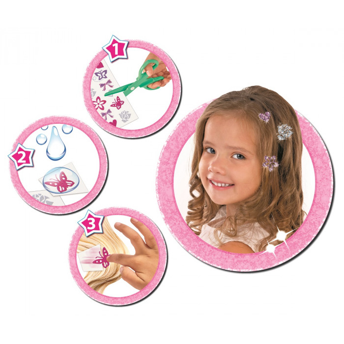 Вау! Создавай прически с помощью блестящих наклеек! Просто расчеши куклу, намочи водой наклейки и прижми к волосам Штеффи!