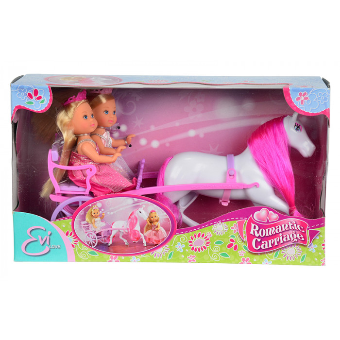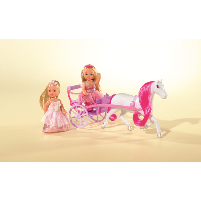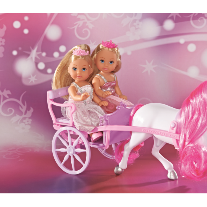 Куколка Еви-принцесса позвала свою подружку-принцессу из соседнего королевства на прогулку в город, чтобы пройтись по самым модным бутикам и выбрать новые наряды для их королевской жизни. Принцессы всё утро наряжались в прекрасные платья, и каждая подобрала в тон наряду великолепную тиару. Их длинные прекрасные волосы можно заплетать в различные прически.Как настоящие принцессы, они отправляются на прогулку в сказочной карете! Красивая белая лошадка с розовой гривой и блестящими копытцами с удовольствием будет катать в карете обеих принцесс!