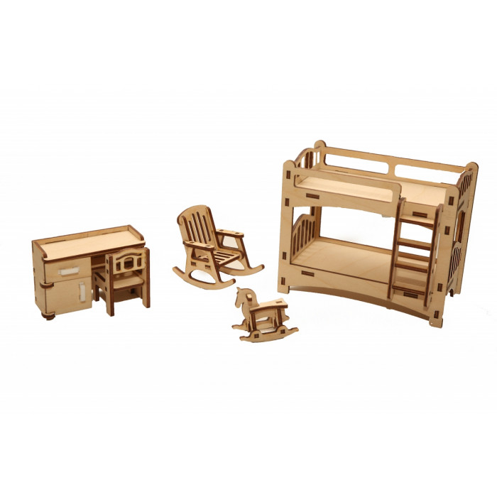 Гарнитур выполнен максимально реалистично и похож на настоящую мебель типичной детской комнаты. Здесь есть и современная двухъярусная детская кровать с лестницей, и письменный стол со стулом, при этом у стола выдвигается ящик и открывается дверь тумбы. А кресло-качалка и симпатичная игрушка-лошадка придадут комнате уюта.