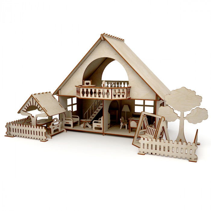 Полный комплект аксессуаров — заборчики, отдельная беседка, деревце и качели, а также мебель для всех комнат.