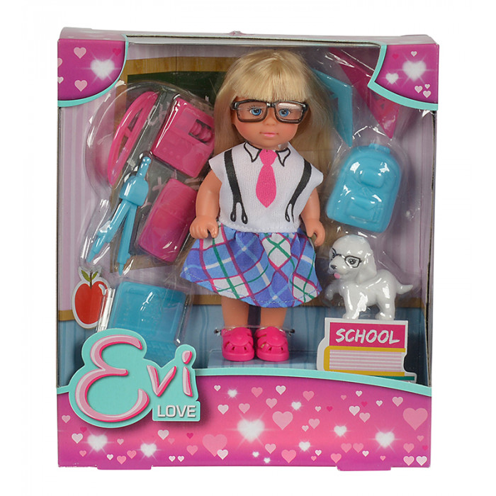 Любимая куколка многих девочек по имени Еви собирается отправиться на свой первый школьный урок! Она собирает в рюкзак школьные принадлежности и ей помогает в этом любимый питомец щенок, который, как и хозяйка, надел очки в темной оправе! Руки и ноги куколки двигаются, поэтому ваша малышка может придать ей различные позы для более реалистичной игры, а в кисти куколки легко вставляются игровые аксессуары из набора.
