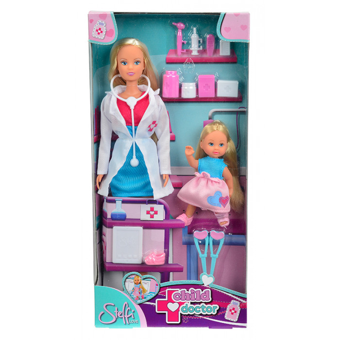 Штеффи теперь детский врач, она обследует и лечит Эви. Для этого у нее есть все необходимое: термометр, стетоскоп, отоскоп, шприц, костыли, гипс для ножки и лекарства. Штеффи теперь детский врач, она обследует и лечит Эви. Для этого у нее есть белый халат и все необходимые инструменты: термометр, стетоскоп, отоскоп, шприц, костыли, гипс для ножки и лекарства. Благодаря этому набору ваша малышка перестанет бояться кабинета врача.
