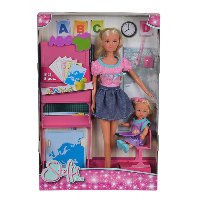 Кукла Штеффи - школьная учительница Еви. В наборе доска с клипсой, парта, книги, указкаДобро пожаловать на школьный урок! Штеффи-учительница научит нас читать, чтобы с помощью книг мы перенеслись в сказочные миры! Кукла-Штеффи указывает указкой на карточки, прикреплённые к школьной доске, а куколка-Еви, которая всегда садится за первую парту, называет буквы. Учиться так весело!