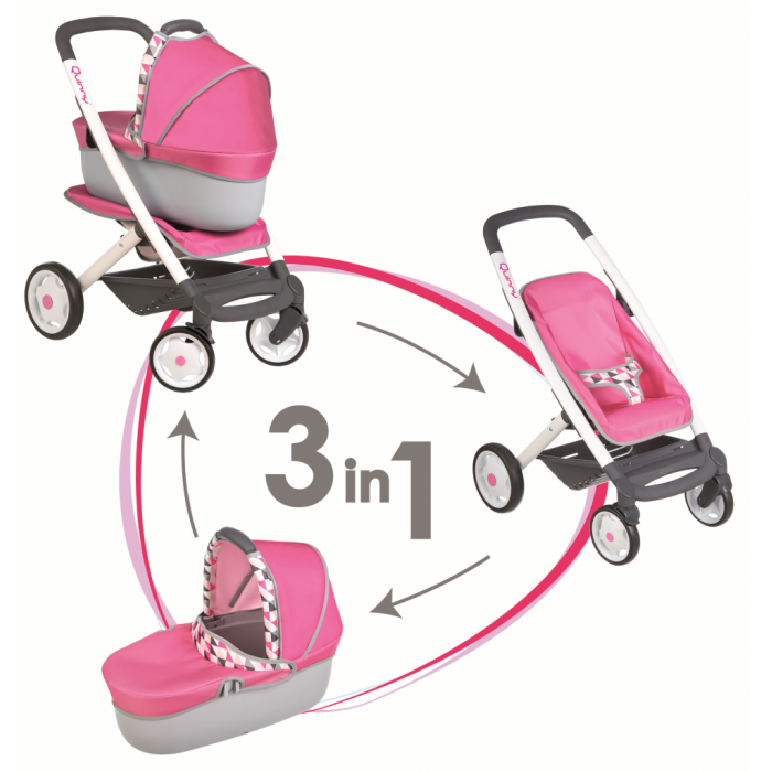 Модная четырехколесная коляска-трансформер для кукол Smoby 3 в 1. С точностью повторяет настоящие коляски Quinny. Подойдет для детей от 3 лет.