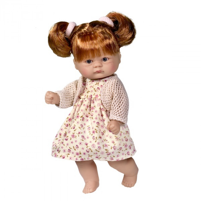 Милая рыжеволосая девочка с двумя хвостиками, с веснушками, ротик закрыт, выполнена из винила, можно купать. Одета в цветочное платьице и бежевую кофточку-балеро.
