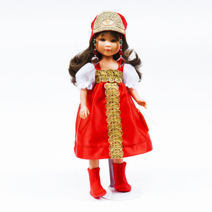 Этот образ русской красавицы с роскошными темными волосами и голубыми глазами в красном сарафане с золотой отделкой и красном кокошнике с подвесками станет отличным подарком не только для вашего ребенка, но и будет оригинальным сувениром. Каждая девочка будет рада плести такой нарядной куколке русские косы, перевязывая их яркими атласными лентами. Размер куколки оптимален, чтобы играть и брать с собой. Полностью выполнена из винила высокого качества.