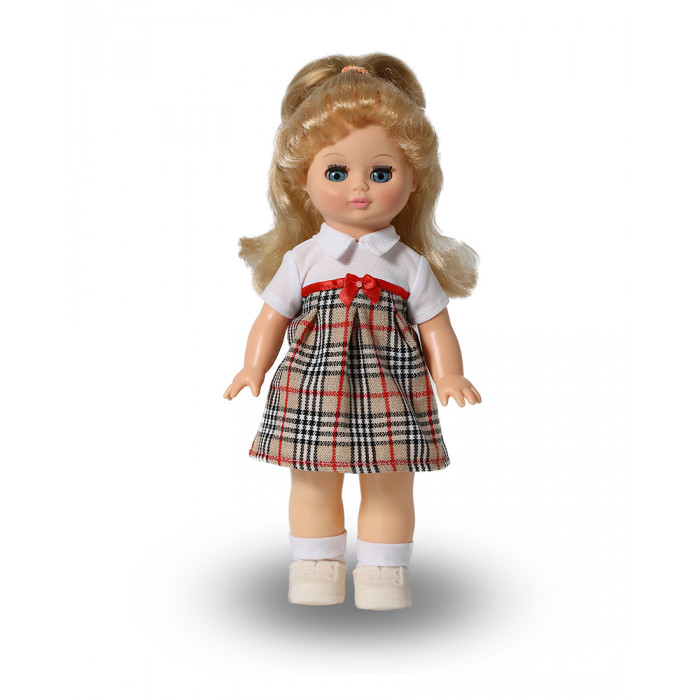 Кукла Жанна из серии "Моя любимая кукла" одета в платье отрезное по линии груди, со складками по нижней части, с короткими рукавами, отложным воротником. Кокетка, рукава и воротник платья из трикотажа, нижняя часть платья из костюмной клетки. На ногах носочки и кроссовки.