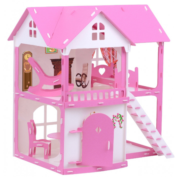 Домик имеет два этажа и состоит из четырех комнат — по две комнаты на каждом этаже. У домика большие светлые окна, и открывающаяся дверь с ручкой и маленьким смотровым глазком-окошечком в центре. В любое, удобное для игр, место можно поставить лестницу. Кроме лестницы в комплект входят пять предметов мебели: стол, два стула, кровать и кресло-качалка; плюс комплект наклеек с элементами домашнего интерьера.