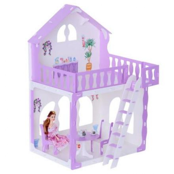 Домик выполнен из современного безопасного материала и имеет два этажа. В элементах конструкции только плавные и изящные линии. Элегантные большие окна, рельефные колонны и плавные изгибы крыши — все это придает домику воздушность и легкость. В набор входят лестница на второй этаж, круглый стол и два стула, выполненные из деталей белого, голубого и розового цветов. Яркие цвета домика принесут радость и поднимут настроение вашему ребенку!
