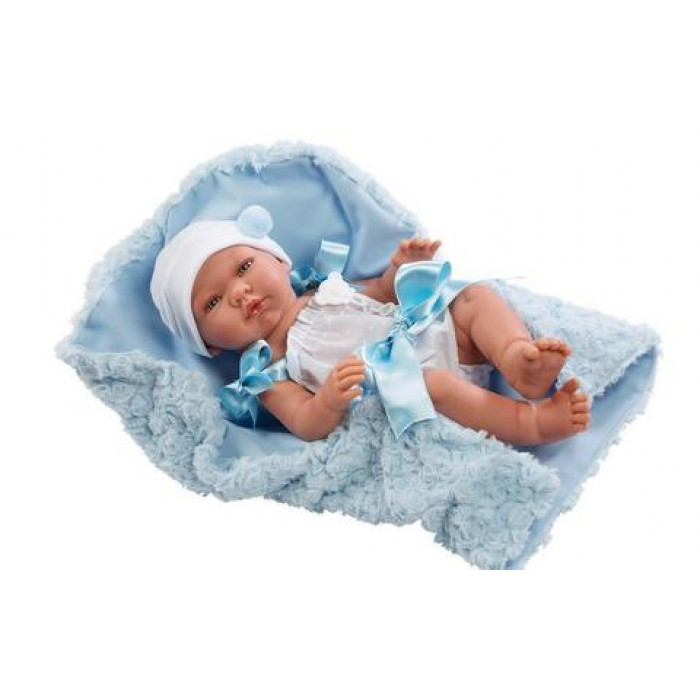 Пабло одет в песочник на голубых атласных завязочках, на голове шапочка с помпоном. В комплекте пустышка с держателем в виде мишки, меховой плед/конверт на атласных завязках. К реборну прилагается настоящий Сертификат о рождении. Упакован в подарочную коробочку ASI.