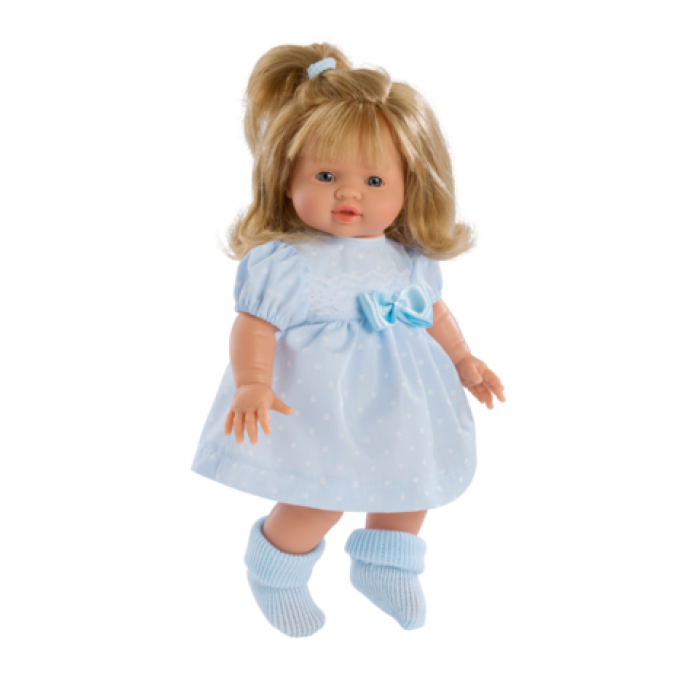 Очаровательная куколка Эмма — новинка из коллекции 2018 года! Голова, руки и ноги выполнены из винила, детально проработаны пальчики, ручки, ножки, складочки. Тельце мягконабивное. У Эммы очень выразительные черты лица, пухленькие щечки с легким румянцем, голубые глазки, губки приоткрыты в улыбке. Волосики светлые, густо прошитые, можно мыть, расчесывать и делать различные прически. Сейчас Эмма с прической "мальвинка".Одета куколка в голубое платье в горох, на поясе декор в виде атласного бантика. На ножках теплые носочки. Упакована кукла в подарочную фирменную коробочку ASI.