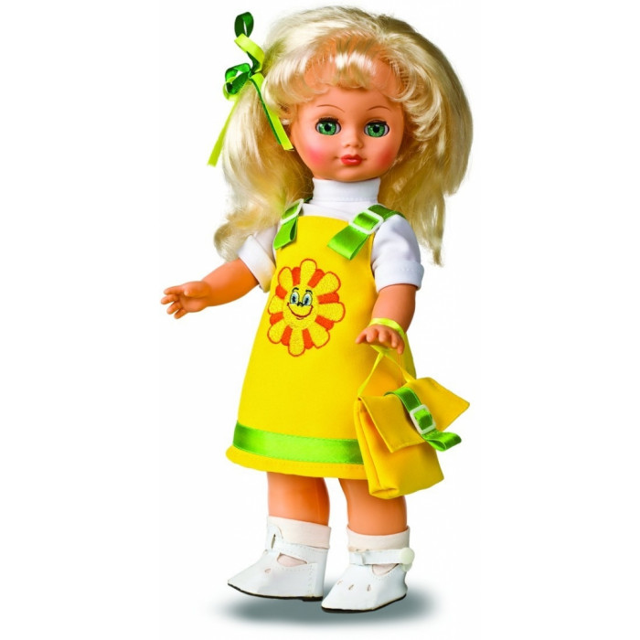 У очаровательной куклы Христины от фабрики Весна лучистые зеленые глаза и пышные светлые волосы. На ней надеты желтый сарафанчик с вышивкой, белая блузка и носочки из трикотажа.