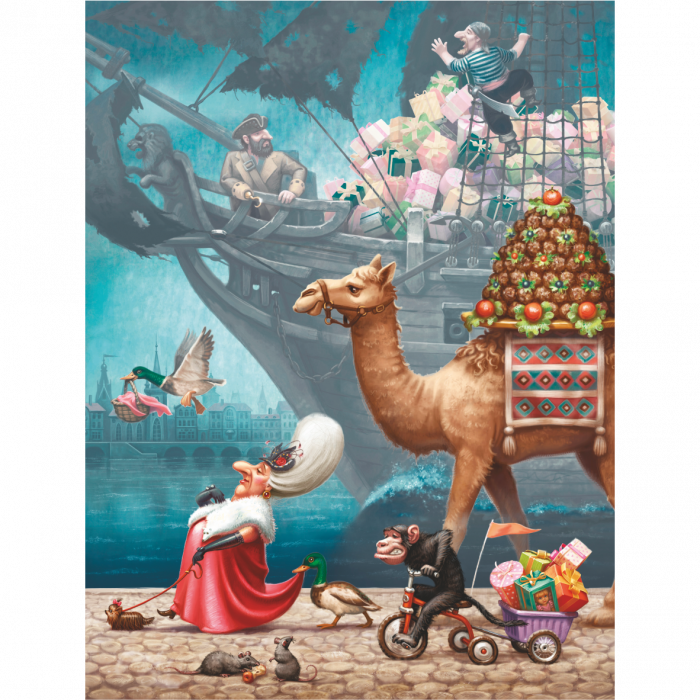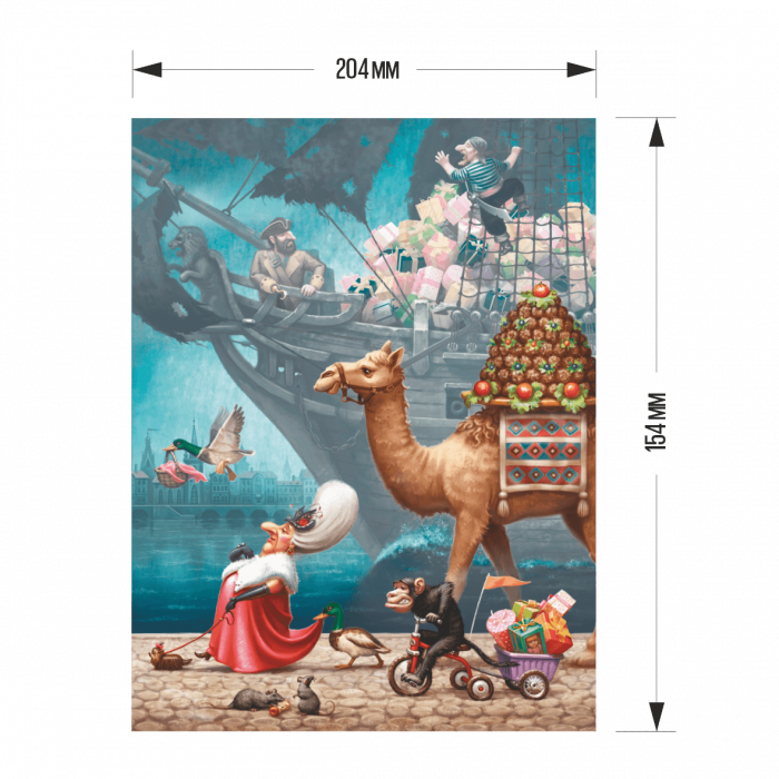 Наша бабушка агент:Через целый континентПровезла она товарСквозь моря и сотню стран.Ей пришлось маскироваться: Даже злою притворяться,Чтоб проверки на путиБеспрепятственно пройти. А товар тот непростой,Чувствую, для нас с тобой.Ведь такие кораблиЛишь сокровища везли!Может быть шелка в мешках, И алмазы в сундуках?А в коробках в самом деле Есть диковинные звери?!Чтобы все секреты знать Буду пазлы составлять:Что в корзинке гусь несет,Где удача меня ждет!