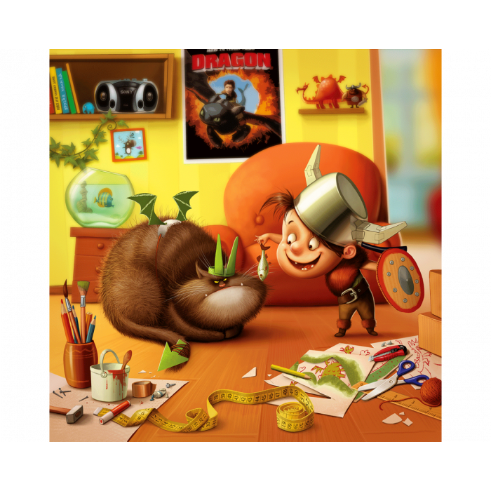 Без дракона жизнь не та - Оседлал малыш кота. Только мало оседлать, Должен кот драконом стать! Вот - рога, а вот - седло. Стать драконом нелегко! Крылья мы коту дадим - В путешествие летим! Над диваном, над столом... Дом перевернем вверх дном! Это горы и моря... Ведь старались мы не зря! Встретили кого в пути? Ну-ка, пазлы собери: Из помеченных деталей Соберешь, кого встречали! С метками достань детали. Кто в дороге их встречает? Тот, кто пазлы соберет, Необычный мир найдет!