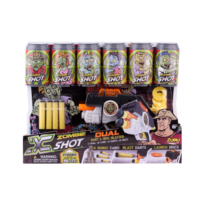 Зомби-бластер поставляется с отдельным комплектом аксессуаров — патронами и дисками, а еще — мишенями для стрельбы. Он стреляет одновременно дисками и патронами, которые безопасны даже в случае, если попасть ими в человека с близкого расстояния.