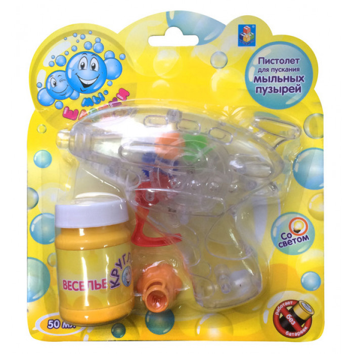 Мыльные пузыри с механическим пистолетом, оснащенным подсветкой. Работает без батареек. Объем бутылки 50 мл.