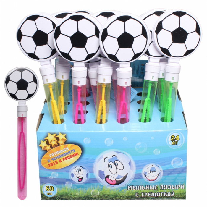 Мыльные пузыри с насадкой-трещоткой в виде футбольного мяча. Потрясите колбу, и трещотка издаст шумные звуки! Пускайте мыльные пузыри и болейте за любимую команду! Объем колбы 60мл.
